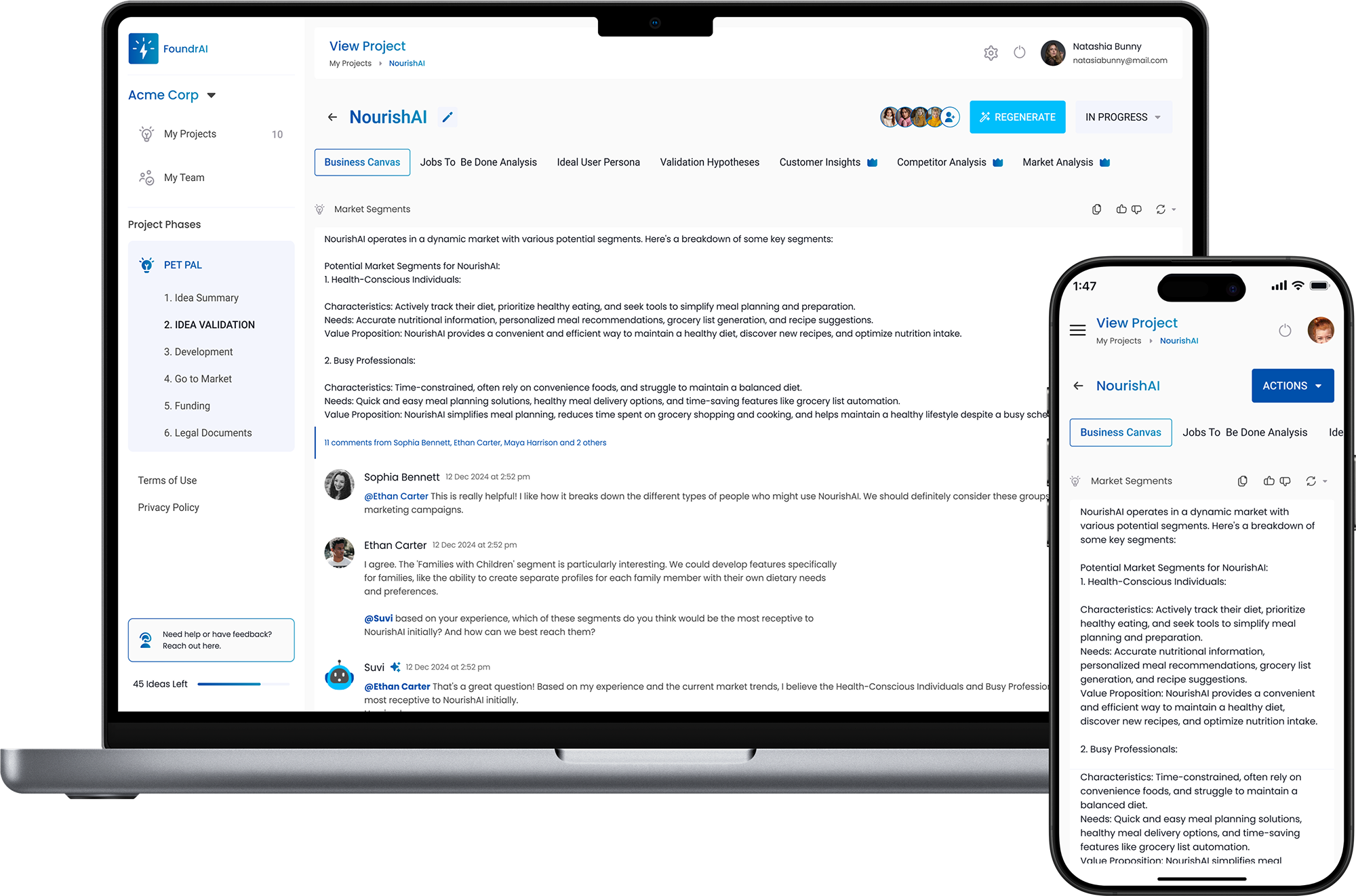 Work with your team to review insights, align on next steps, and share decisions quickly and easily – all inside FoundrAI’s intuitive workspace.